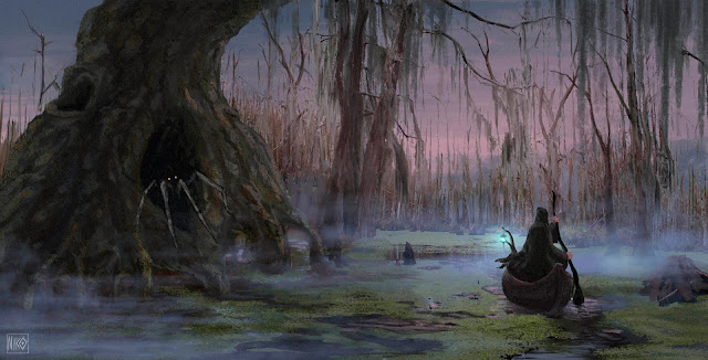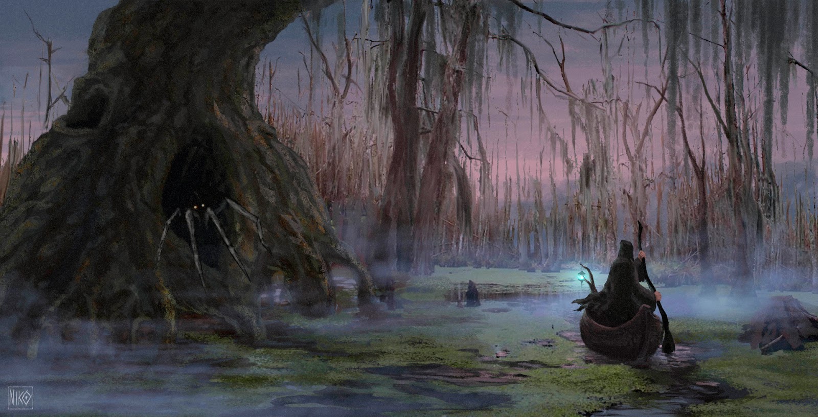 The slightest magical contamination - a wizard's library, a spilled potion, a buried artifact - tips spiders from cunning into true intelligence and self-awareness. They learn to write. They collaborate and build structures. Larger spiders occupy the same niche as wolves. Some species are pack hunters. Some, the most feared, hunt alone. They prefer lowland forests with dense trees, few paths, and limited sunlight.